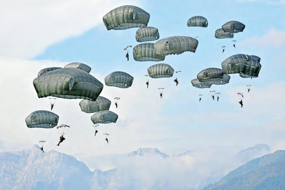 and cross the South Ramp onto the waiting aircraft. Two C-130s, part of the 86th Airlift Wing at Ramstein Air Base, had made the trip over the Alps, Oct. 14, and stayed for the four-day event. Only one of them was available to make jumps the last three days due to a mechanical issue. That left some soldiers unable to jump. Those were bused later to the drop zone to join their comrades and take part in training on the ground. Some watched as their fellow Sky Soldiers glided onto the landing zone. All of those jumping had done so at least a few times before, having graduated from jump school. Some were making their first jumps onto the zone, though. A few others had achieved the designation of master jumper – with at least 64 jumps to their credit. Given the brigade’s