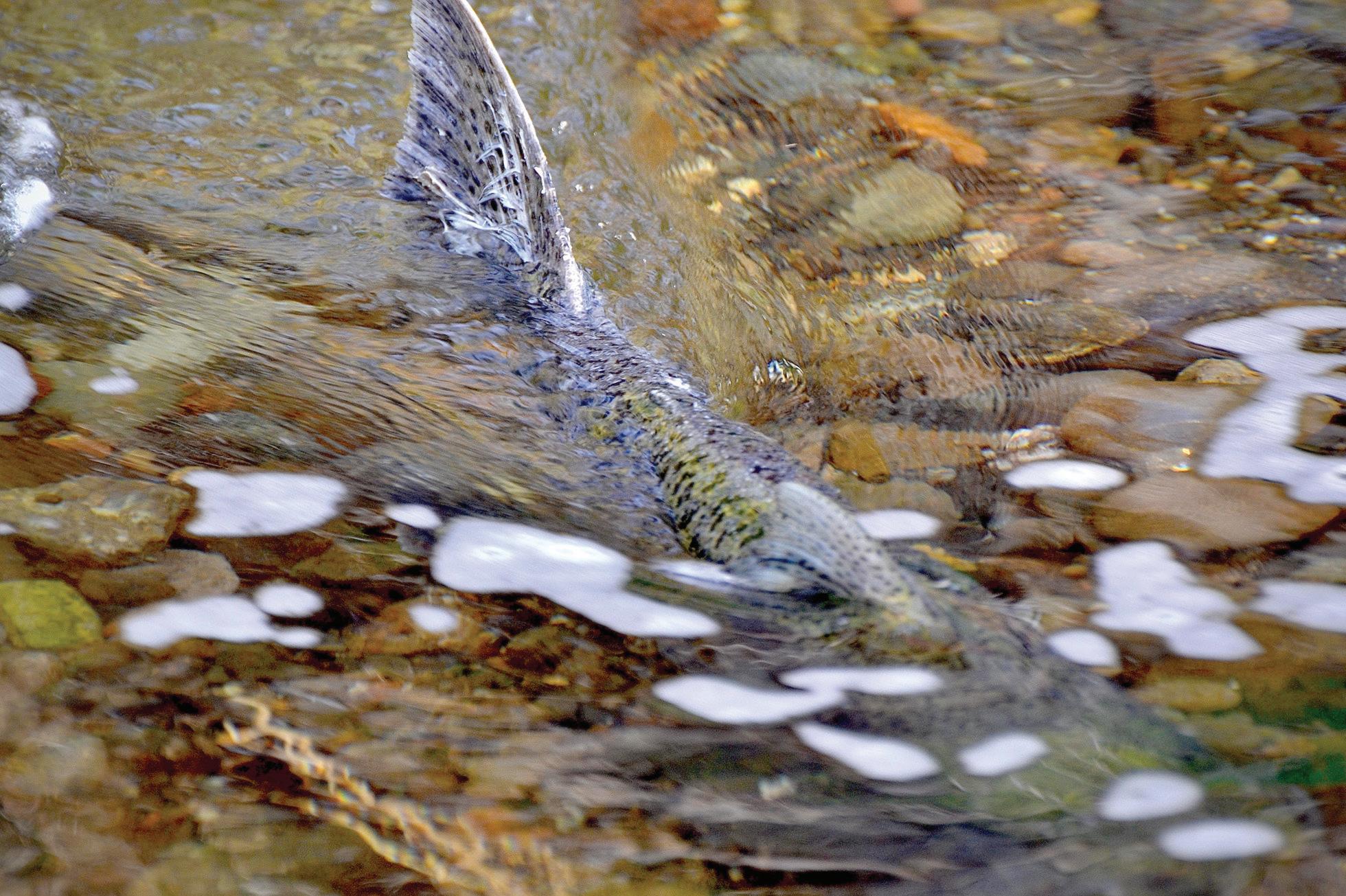 LEFT: Tattered by its long migration from the sea, a Chinook salmon spawns in Putah Creek.
