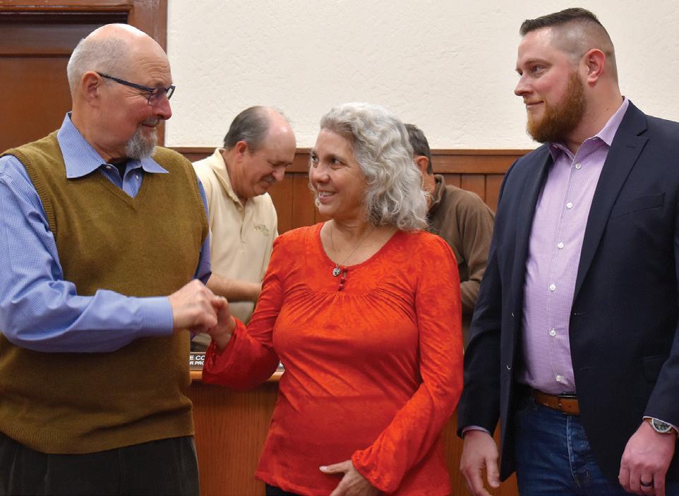 Crystal Apilado/Winters Express Newest councilmembers Albert Vallecillo, Carol Scianna and Richard Casavecchia share congratulations after taking their oath of office on Dec. 13.