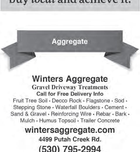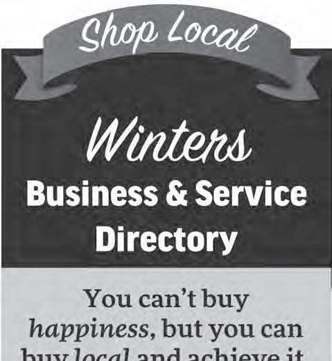 EXPRESS 2 Main St., Winters, CA 530.795.4503 buckhornsteakhouse.com 1 Main St., Winters, CA 530.795.2682 putahcreekcafe.com Service all makes & models Accept all major credit cards Family owned & operated 27990 County Road 90 Winters, CA 95694 www.pearcehvac.com State Contractor Lic# 864483 116 D Street Davis, CA 95616 530-798-5500 www.smith-funerals.com FD-992 WINTERS AGGREGATE 4499 PUTAH CREEK ROAD WINTERS, CA 95694 OFFICE: (530) 795-2994 CELL: (707) 430-6734 WE OFFER: • SAND GRAVEL • ROCK • PAVESTONE • SOIL • BARK • REDI MIX • CONCRETE • EQUIPMENT RENTAL WE DO PICK UP & DELIVERY 184 E. Grant Avenue, Winters (530) 795-1938 · Dry Cleaning · Laundry · Alterations CUSTOM CLEANERS $1 including tax Shakespeare theatre workshop registration now open News, Page 6 Local farm stand owner takes it up next level Features, Page 1 Volume 140, Number 2 — Locally-owned since 1884 Winters, Yolo County, California, Wednesday, February 8, 2023 The hometown paper of Jessica Smith Features ........................ B-1 Classifieds ................... B-4 Community .................. A-6 Eventos hispanos ....... A-3 Opinion ......................... B-3 Real Estate ................... B-2 Sports ........................... A-2 Index Date Rain High Low Feb. 01 .00 59 29 Feb. 02 .00 57 30 Feb. 03 .28” 56 34 Feb. 04 .01” 57 40 Feb. 05 .44” 57 47 Feb. 06 .01” 57 35 Feb. 07 .00 62 36 Rain for week: 0.74 in. Season’s total: 23.45 in. Last sn. to date: 17.09 in. Weather Winters rainfall season began 7/1/22. Weather readings are taken at 9 a.m daily by local weatherman Joe Bristow.