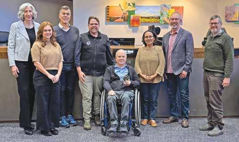 From left, Yolo LAFCo Executive director Christine Crawford, Board clerk Desirae Leverett, Public member Erik Vink, County Supervisor Lucas Frerichs, Winters city member and Board chair Bill Biasi, Davis city member Gloria Partida, County Supervisor Oscar Villegas and Deputy Director JD Trebec pose with a recognition plaque honoring Biasi at the Yolo LAFCo special meeting on Jan. 29.