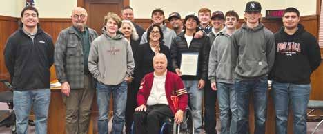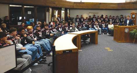 Winters High football players at the Winters City Council meeting Jan. 20 celebrate their historic state championship, with Mayor Pro Tempore Bill Biasi (center front) donning his WHS jacket in support of the Warriors.