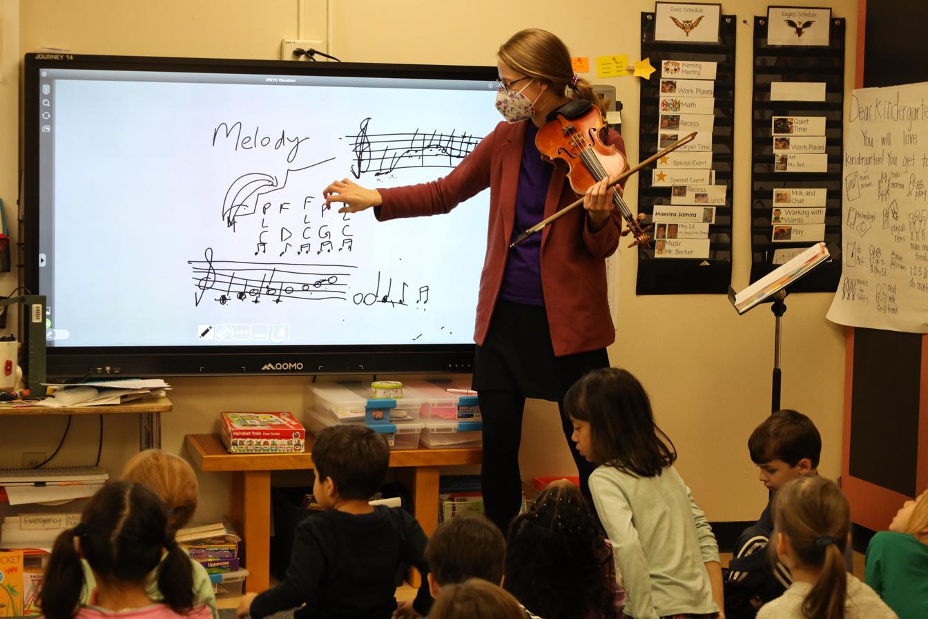 As part of the program, two violinists, one violist, and one cellist from the Madison Symphony Orchestra visit four times a year to host mini music lessons for each classroom and finish up the day with a school-wide mini concert! Later this spring, students will get to attend a field trip to the Overture Center to hear the entire Madison Symphony Orchestra!