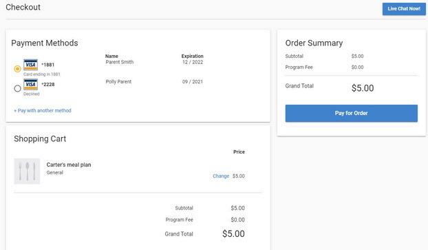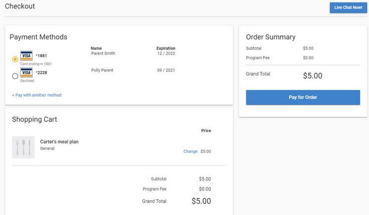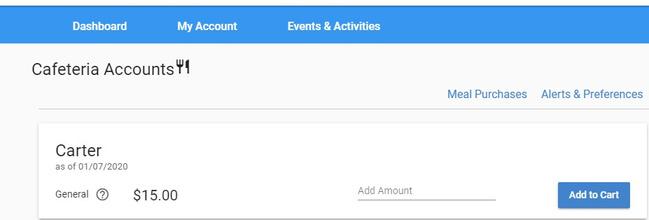 Inicie sesión en su cuenta de MyPaymentsPlus. En la página principal para padres, verá "Cuentas de Cafetería" y el nombre de su estudiante. Ingrese el monto del pago y haga clic en "Agregar al carrito".