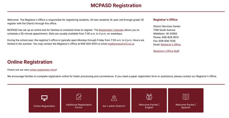 La inscripción en línea está disponible en nuestro sitio web Visite www.mcpasd.k12.wi.us y haga clic en el botón Registration de Inscripción en la página principal
