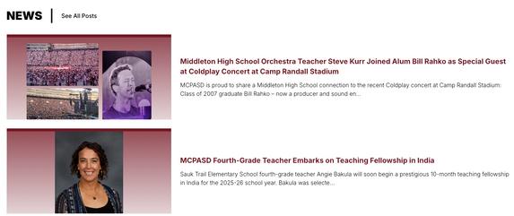 Hemos sidonombrados uno delos Mejores Lugares paraTrabajarenWisconsin y el60% de nuestro personalcuentacon títulos universitarios También estamos clasificadoscomoel distritoescolar número1 del condado deDaney albergamoslaEscuela PrimariaPopeFarm, laescuela primariamejor valoradadel estado LaEscuela PreparatoriaMiddleton cuentacon elreconocimientonacionalde US News & World Report