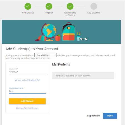 Añade a tu estudiante a tu nueva cuenta. Si no conoces su número de identificación, puedes omitir este paso y volver más tarde.