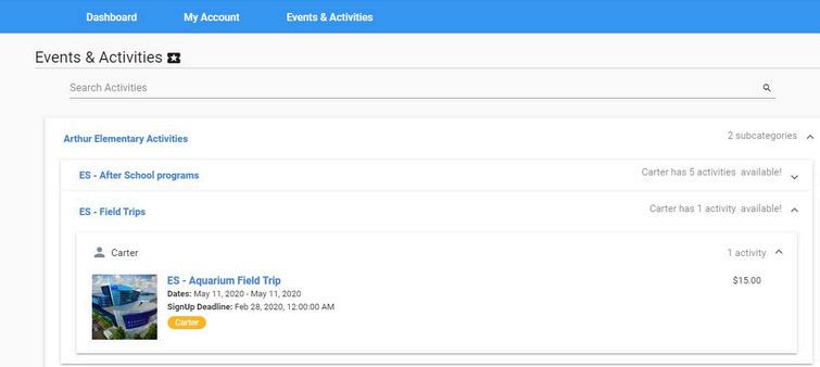 Inicie sesión en su cuenta de MyPaymentsPlus. En la página de inicio, seleccione "Eventos y actividades" . Verá una lista de actividades disponibles para su estudiante.