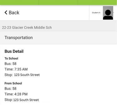 En la página de Transporte, ahora puede ver la siguiente información sobre las rutas de autobús de su estudiante: