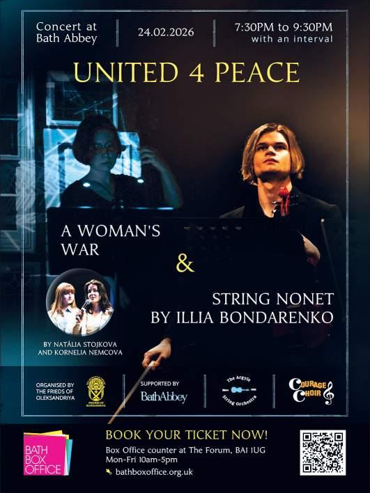 A concert of Ukrainian music, presented by The Friends of Oleksandriya. This inspirational concert in the transcendent setting of Bath Abbey’s nave on Tuesday 24 February at 7:30pm, will mark the fourth anniversary of the full-scale invasion of Ukraine and to raise funds for the Ukrainian city of Oleksandriya. The programme includes an original String Nonet by acclaimed Ukrainian composer Illia Bondarenko and audiovisual work, A Woman’s War by composer Kornélia Nemcová and artist Natália Štojková. Bondarenko’s beautiful instrumental composition is reimagined with a new version of A Woman’s War, uniting with vocal trio, The Ruffians, Bath’s Argyle String Orchestra, and a host of volunteer vocalists. Tickets from £10. For more details: bathboxoffice.org.uk
