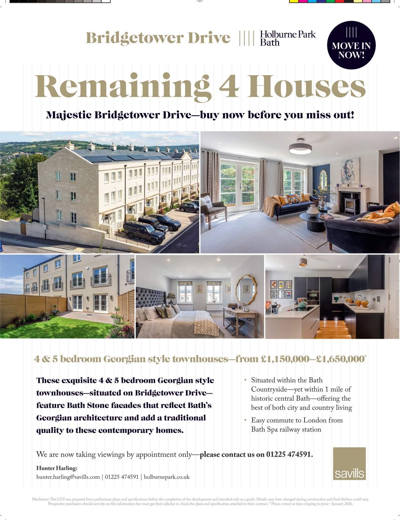 These final four townhouses on Bridgetower Drive complete the Holburne Park story – now ready to move into, this is the last chance to secure a new home in one of Bath’s most desirable modern neighbourhoods. Prices from £1,150,000, contact Savills on 01225 474591 to arrange your viewing.