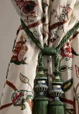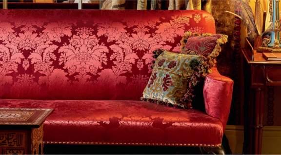 Pictured on this page, left-to-right, top-to-bottom: Vintage Ornate Wood Frame Overmantel Mirror, 85 x 115cm, Gold, £230, johnlewis.com; Zoffany Hampton Embrodery, Tapestry, £256 per metre, zoffany.design; Trimmings by Samuel & Sons (and top right), samuelandsons.com; Two bespoke handcrafted curtain poles from Hunter Hyland, hunterhyland.co.uk; Black Floral Tapestry Table Lamp, Graham and Green, £80, grahamandgreen.co.uk; Square Stonewashed Velvet Cushions, Graham and Green, £45, grahamandgreen.co.uk; Bronze Red paint, Little Greene, littlegreene.com; and Theatre Red paint, Little Greene, littlegreene.com