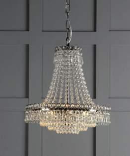 Pictured on this page, left-to-right, top-to-bottom: Pontefract paint on the wall, radiator and door, and an excellent example of wainscoting from Paint & Paper Library, paintandpaperlibrary.com; Laura Ashley Enid Crystal Glass Chandelier, John Lewis, £499, johnlewis.com; Luxurious 19th century Gothic revival damask fabric from Watts 1874, watts1874.co.uk; Aged Effect Ceramic Planter, Cox & Cox, £30, coxandcox.co.uk