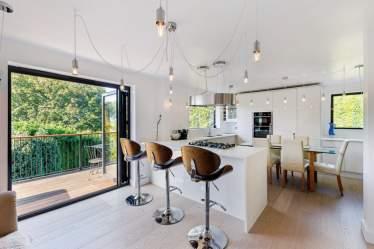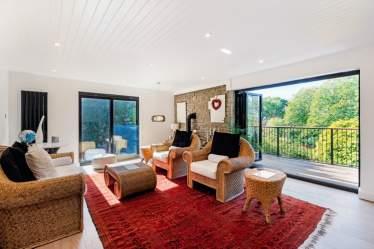 Detached, modern, family home with a generous footprint totalling 3176 square feet and a high specification throughout | Architecturally remodelled, refurbished and extended by the current owners with further annex conversion potential for multi-generational living or income generation | High spec, open plan kitchen dining room with Neff/SMEG appliances, breakfast bar and separate utility | Sun terrace with far reaching, west facing views and two further al fresco dining terraces | Light, dual aspect sitting room with gas burner, formal dining room and a study | Five double bedrooms and five bath/shower rooms, three of which are en suite | Stunning entrance hall with high vaulted ceilings and abundant natural light | Integral, double garage, driveway and ample parking for multiple cars | Private and secure, landscaped and lawned, wrap around gardens of circa half an acre with a garden gym / home office pod and cat 6 broadband | No onward chain