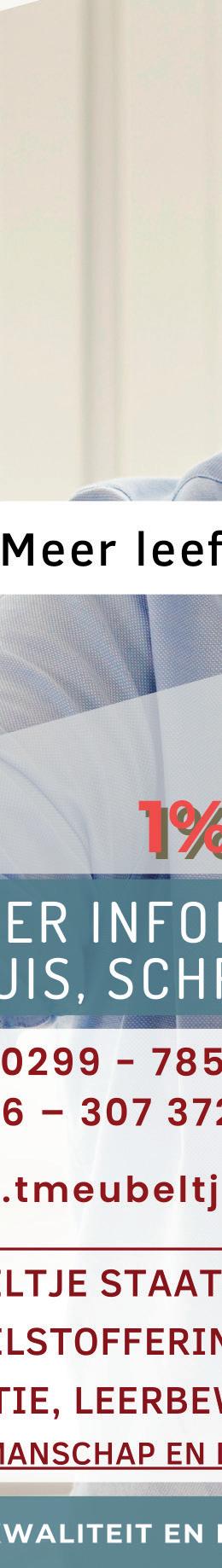 www.stracke.nl Johan Kruizinga Zanger, Gitarist, Troubadour 06-23056260 www.levenmethoogbegaafdheid.nl Koggestraat 4, 1693 GB Wervershoof LEV biedt verschillende diensten voor hoogsensitieve en/of hoogbegaafde kinderen, volwassenen en hun begeleiders op school en thuis: • Coaching • Leer met LEV Traject • Lezingen en trainingen leven met hoogbegaafdheid Bezorg jij onze reizigers een onvergetelijke vakantie? Wij zijn op zoek naar enthousiaste vrijwilligers! e reizigers een Bezorg jij onze reizigers een onvergetelijke vakantie? www.buitenhof.nl/vrijwilligers 0182 - 587 055 Wist je dat 3 op de 10 kinderen nauwelijks buiten speelt? Dat is niet ok. Koop een lootje en laat meer kinderen meer buitenspelen! www.jantjebeton.nl/lootje 1 op de 3 vrouwen krijgt dementie Geef nu voor meer onderzoek, zodat dementie niet jouw toekomst wordt. stopdementie.nu