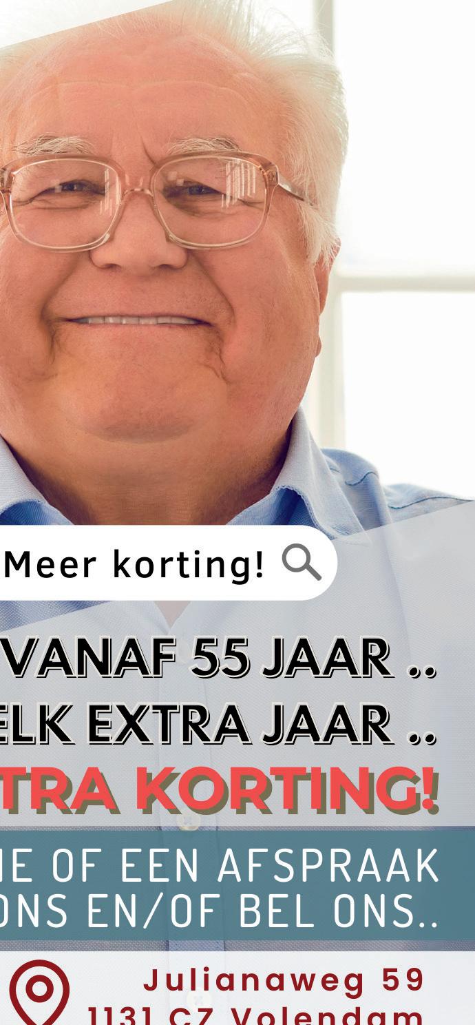 Administraties en Adviezen Uw boekhouding, prettig geregeld! Zowel voor ondernemers als particulieren. Compagnie 52-A 1689 AG Zwaag 0229 - 213543info@abacushoorn.nl www.abacushoorn.nl Profiteer nu met Omringpas www.omring.nl 088 - 206 79 99 Aantrekkelijke korting op verzekeringen van Univé en Zilveren Kruis 4 keer gratis het Omring Magazine Korting in winkels o.a. Holland & Barrett, Fietsenstunt.nl en Karsten Travelstore Korting op trainingen zowel fysiek als online Korting op diensten aan huis o.a. maaltijdservice Altijd 10% korting in de Omringwinkel Profiteer van ruim 100 voordelen met Omringpas. Bekijk het volledige aanbod op omring.nl/omringpas Vraag nu uw pas aan! Met binnenband normaal € 4285 € 2995 Met binnenband & montage normaal € 5535 € 3995 * Bandenmaat: 28x1 5/8 x 1 3/8 GRIG FIETS EN REPARATIE SPECIALIST Betje Wolffplein 1 1628 NA Hoorn T. (0229) 714570 info@grig-tweewielservice.nl www.grig-tweewielservice.nl * Bandenmaat: 28x1 5/8 x 1 3/8