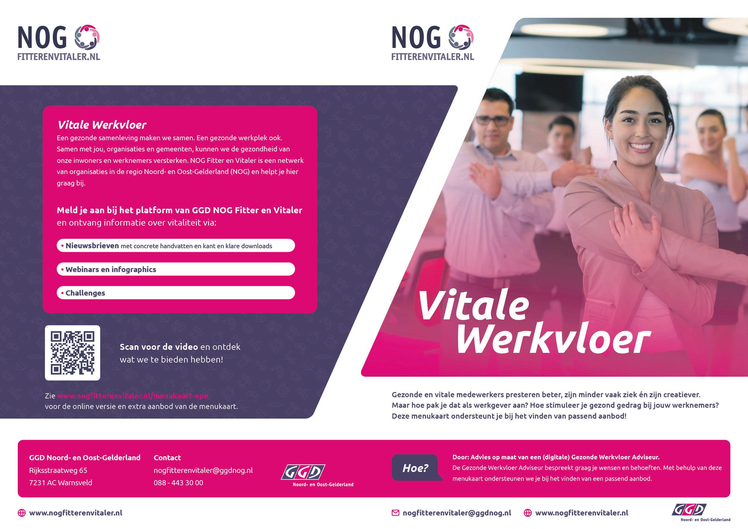 Gezondeenvitalemedewerkerspresterenbeter,zijn creatieverenmindervaakziek.Ookervarengezondeen tevreden medewerkers meer werkplezier waardoor ze langerinzetbaarzijn.VergrootdevitaliteitvanjewerknemersensluitjegratisaanbijhetplatformNOGFitter en Vitaler van de GGD Noord- en Oost-Gelderland voor informatie,concretehandvattenentipsovereengezondewerkvloer.