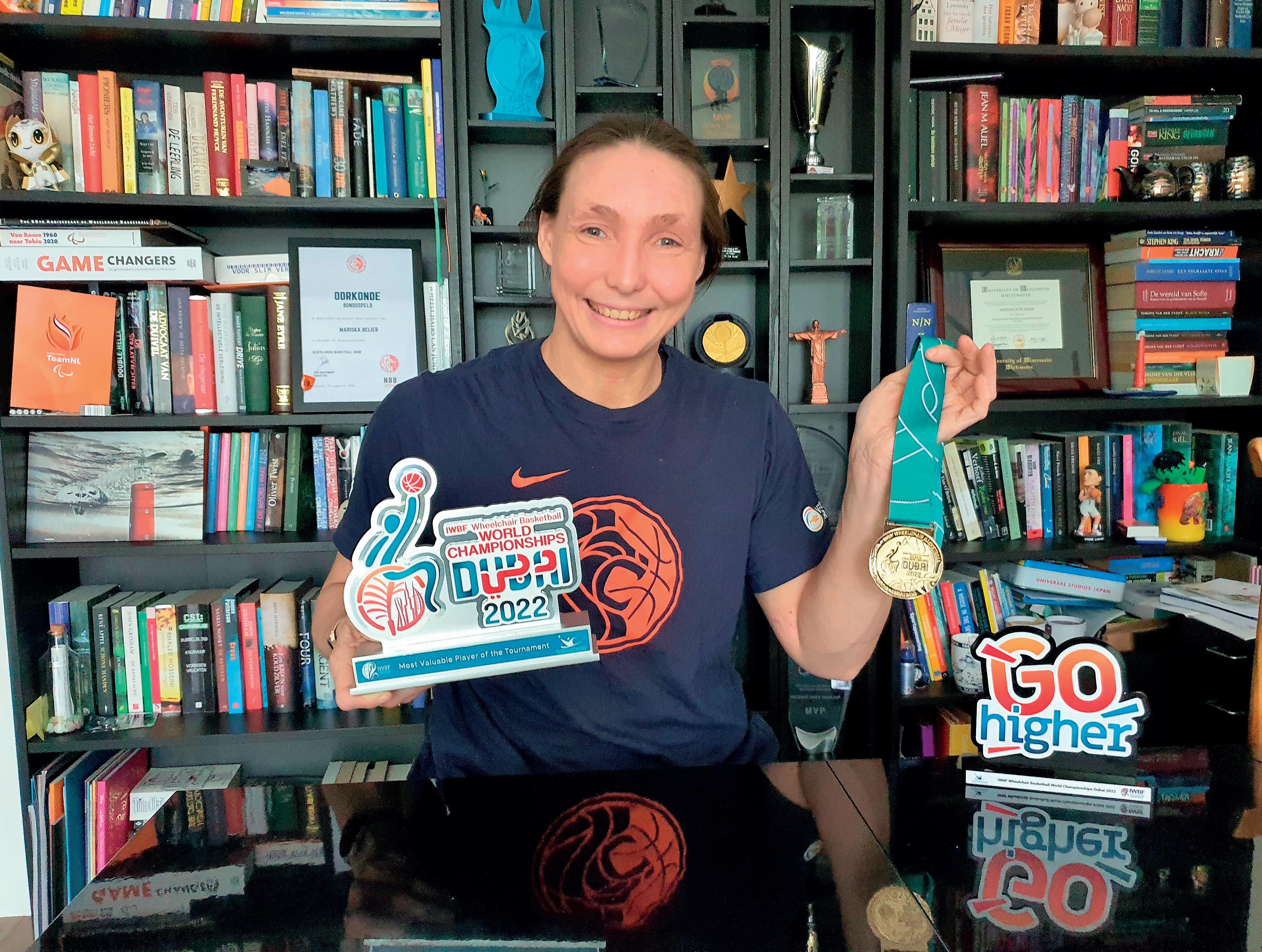 In haar sfeervolle Doorwerthse appartement ‘straalt’ niet alleen rolstoelbasketbalster Mariska Beijer zelf, maar ook ‘het hoge bezoek’, moeder Louise. De reden? Mariska won, met het Nederlandse rolstoelbasketbalteam en dat al voor de zesde keer op rij een aansprekende finale. Drie keer Europees kampioen, paralympisch kampioen en in Dubai voor de tweede keer wereldkampioen. Mariska is ‘superblij’ en moeder Louise ‘supertrots op die meid’. Op de eettafel ligt het tastbare bewijs, de gouden medaille, die geflankeerd wordt door een persoonlijke prijs voor Mariska zelf, zij werd verkozen tot meest waardevolle speelster van het toernooi (MVP, Most Valuable Player of the Tournament) en kreeg zelfs de bijnaam ‘Queen’. ,,We speelden een geweldig toernooi en de ontlading na de winst was dan ook groot. Trots overheerste. Natuurlijk waren we de grote favoriet, maar dan moet je het toch wel ‘even’ waarmaken. En als het met zijn allen er keihard voor werken zich dan weer uitbetaalt dan mag je ’superblij en ongelofelijk trots’ zijn, toch?” En ‘het met zijn allen’ heeft ook nog een mooi ander ‘Doorwerths tintje, want ook teamgenoten Bo Kramer en Lindsay Frelink hebben Doorwerth als hun thuisbasis. ,,Ja, zij wonen hier om de hoek”, aldus Beijer met een lach. ,,Ook zij maken al jaren deel uit van de Orange Lions, zoals onze mooie bijnaam luidt. Drie meiden uit Doorwerth, dat is echt wel bijzonder, toch?