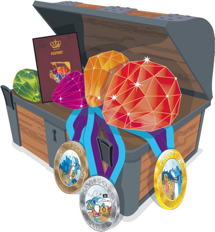 Alle avonturen staan beschreven in een paspoort dat zwemleskinderen krijgen bij de start van het zwemlestraject, samen met een prachtige schatkist. Gaandeweg wordt de schatkist gevuld met edelstenen en worden er zegels verdiend voor in het paspoort. Na het behalen van een diploma wordt de schatkist volgemaakt met een medaille die een speciale plek heeft in de schatkist. Als het C-diploma is behaald, is het avontuur ten einde en wacht de grootste beloning: De Reuze Robijn.