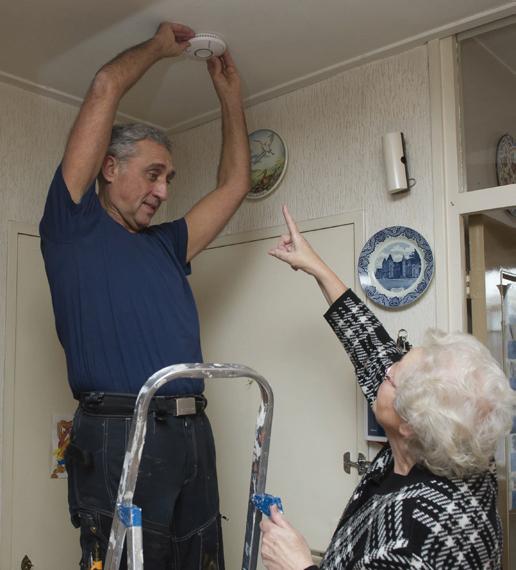 ventieklapper en een checklist met Brandveilig Leven-tips. Gewapend met rookmelders en plakstrips gaat Kees aan de slag. ‘Fijn dat er niet geboord hoeft te worden,’ merkt mevrouw Jansen op. En wat heerlijk dat ik nu weer veilig kan slapen!’
