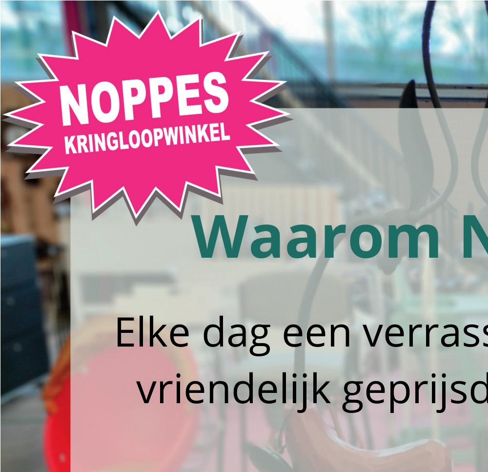 Noppes Kringloopwinkel is een van de grootste kringlooporganisaties van Nederland.Wezijneensocialeonderneming zonder winstoogmerk. Ons doel is: werken aan duurzaam hergebruik en een inclusieve arbeidsmarkt waarin iedereen volwaardig kan meedoen. Om dat te bereiken, werken we nauw samen met burgers, gemeenten en andere partners. In onze veertien kringloopwarenhuizen vind je elke dag wisselend aanbod: van vriendelijk geprijsde basics tot vintage pareltjes. Ruim 3,5 miljoen uniekeproductenvindenjaarlijkseennieuwe