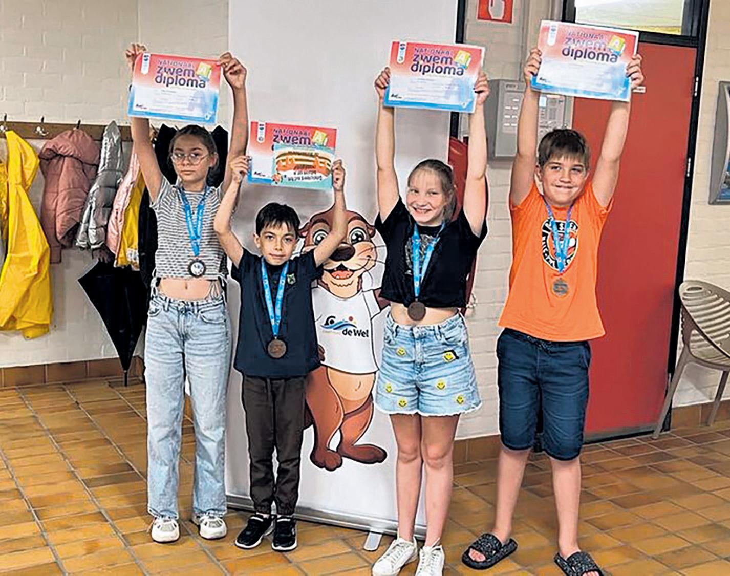DezesjarigeTiesvanderMarelzitingroep 3vandeAntoniusschoolinNoorden.Tiesheeft netvoordatdezomervakantiebegonhetzwemdiplomaBbehaald.Daarishijhartstikkeblijmee,wantnu maghijlekkeroveralinhetdiepe.Binnen2jaarheeft TiesAenBbehaald.Deeersteperiodeverliephetwat lastigvanwegedeCoronamaatregelenwaardoorhij eentijdjenietkonzwemmen.DeWeldeedindeze periodeoverigensergzijnbestomhetzwemmen tochdoortelatengaan.DaarnaastheeftTiesregelmatiglastgehadvanzijnoren,maargelukkigkondat metbuisjeswordenopgelost.Tiesheeftdelessenge-