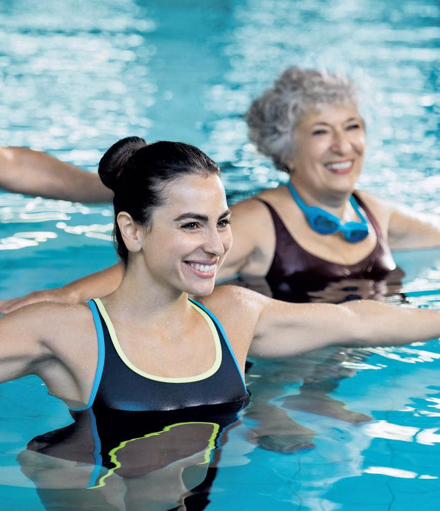 In het water is bewegen gemakkelijker door de opwaartse druk en het risico op overbelasting is minimaal.Er is weinig tot geen druk op de gewrichten terwijl je wel gebruik kunt maken van al je spieren.Tijdens deze