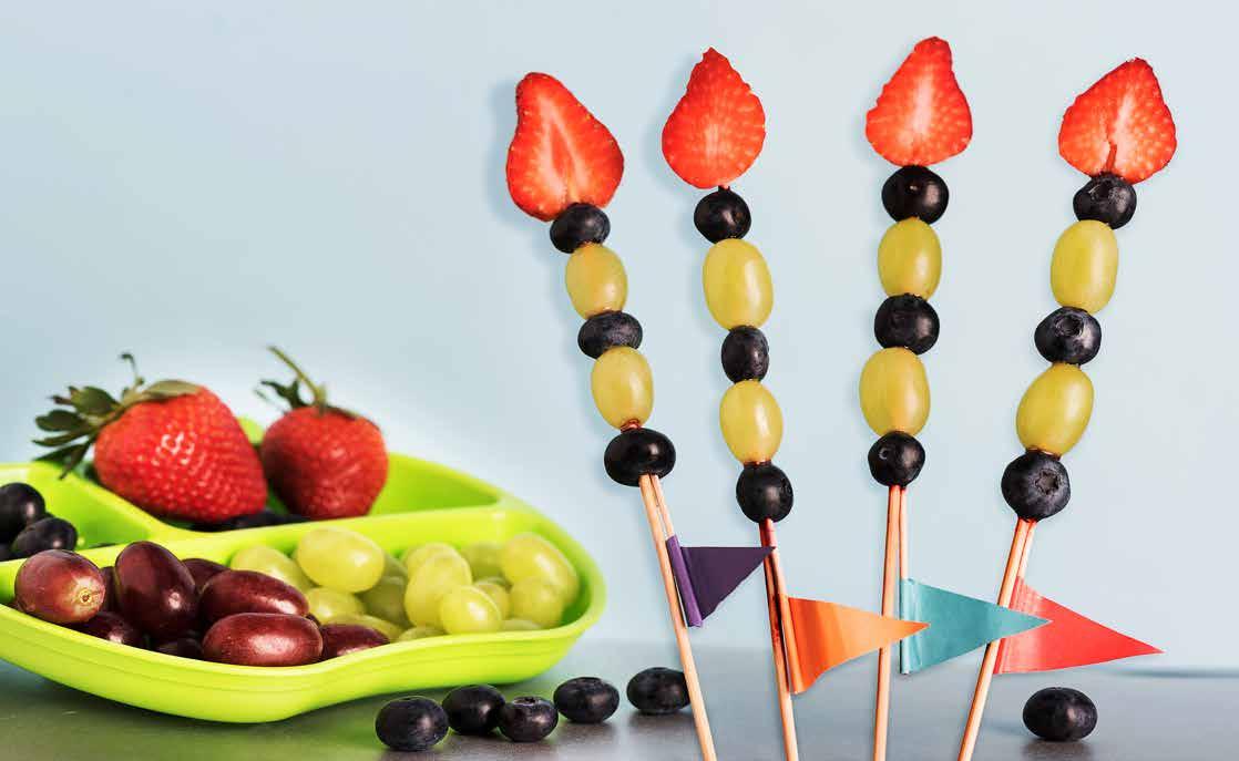 3. Assemble rocket by placing 2 grapes and 3 blueberries onto skewers and topping with half a strawberry.