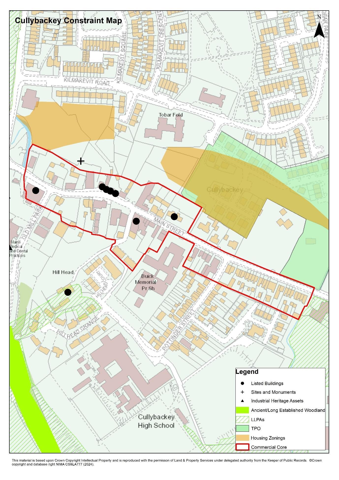 There are several listed buildings, a site/monument and an industrial heritage asset located in the commercial core which may have some impact upon development in their vicinity, (See Cullybackey Constraints Map 30, Appendix A)