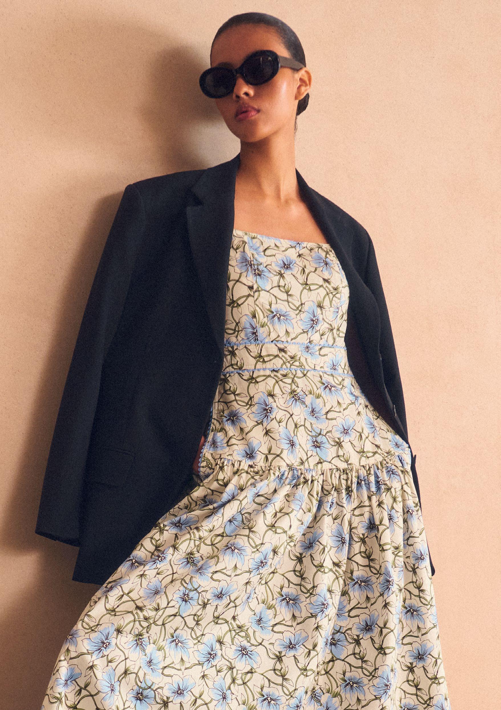 Silk Lily of the Valley Print Maxi Dress + Bandeau, £550, Sharp Shoulder Straight Blazer, £325, Asymmetric Toe Loop Sandal in Black, other colours available, £295, Silk Lily of the Valley Print Blouse, £250, Relaxed Baggy Wide-Leg Jean, £185