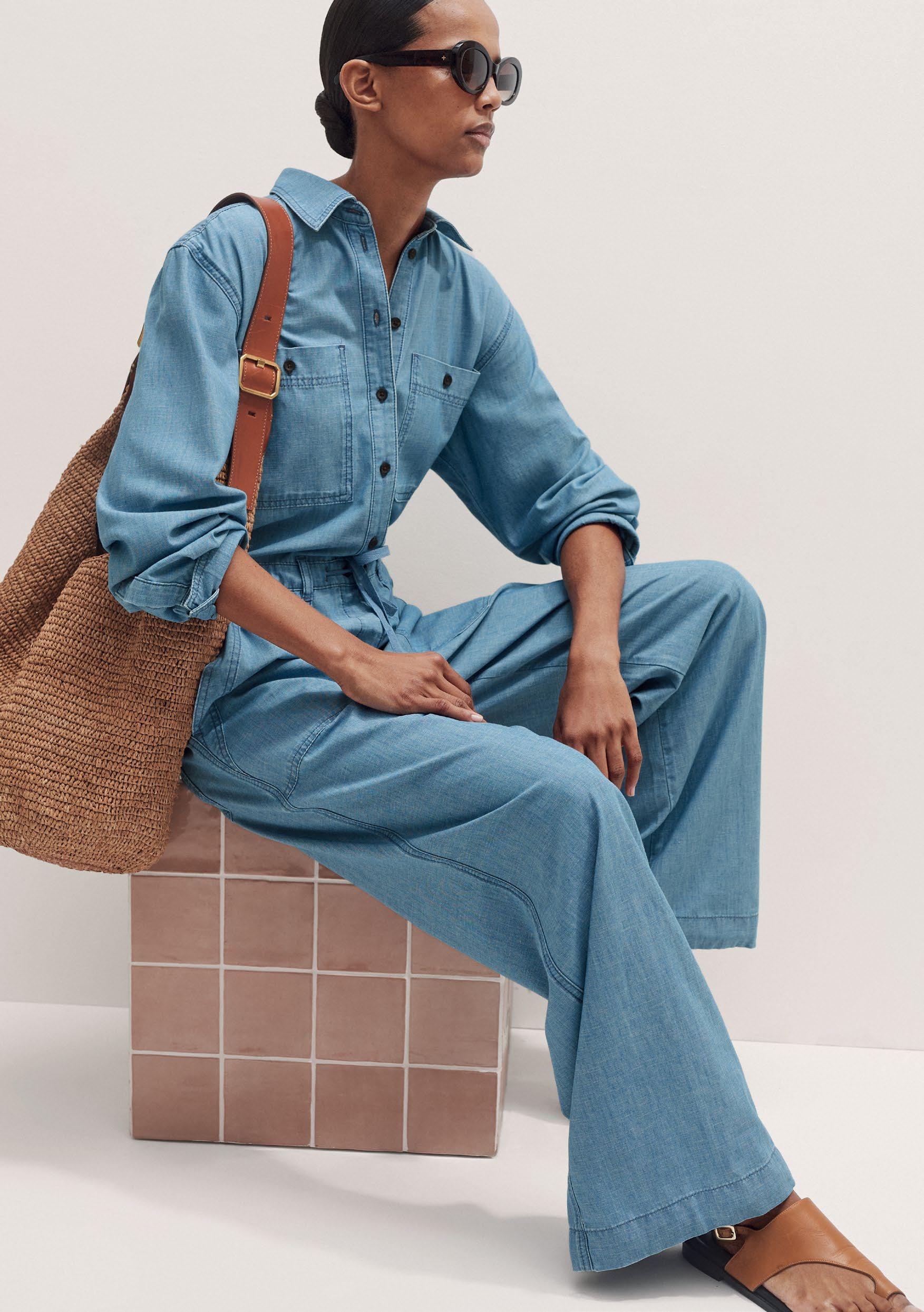 Relaxed Denim Jumpsuit, £250, Asymmetric Toe Loop Sandal in Tan, other colours available, £295, Oval Frame Sunglasses in Black, other colours available, £195, Raffia Hobo Bag, £395, Denim Layering Tunic, £175, Crop Raglan Seam Rib Tee in Vanilla, other colours available, £45