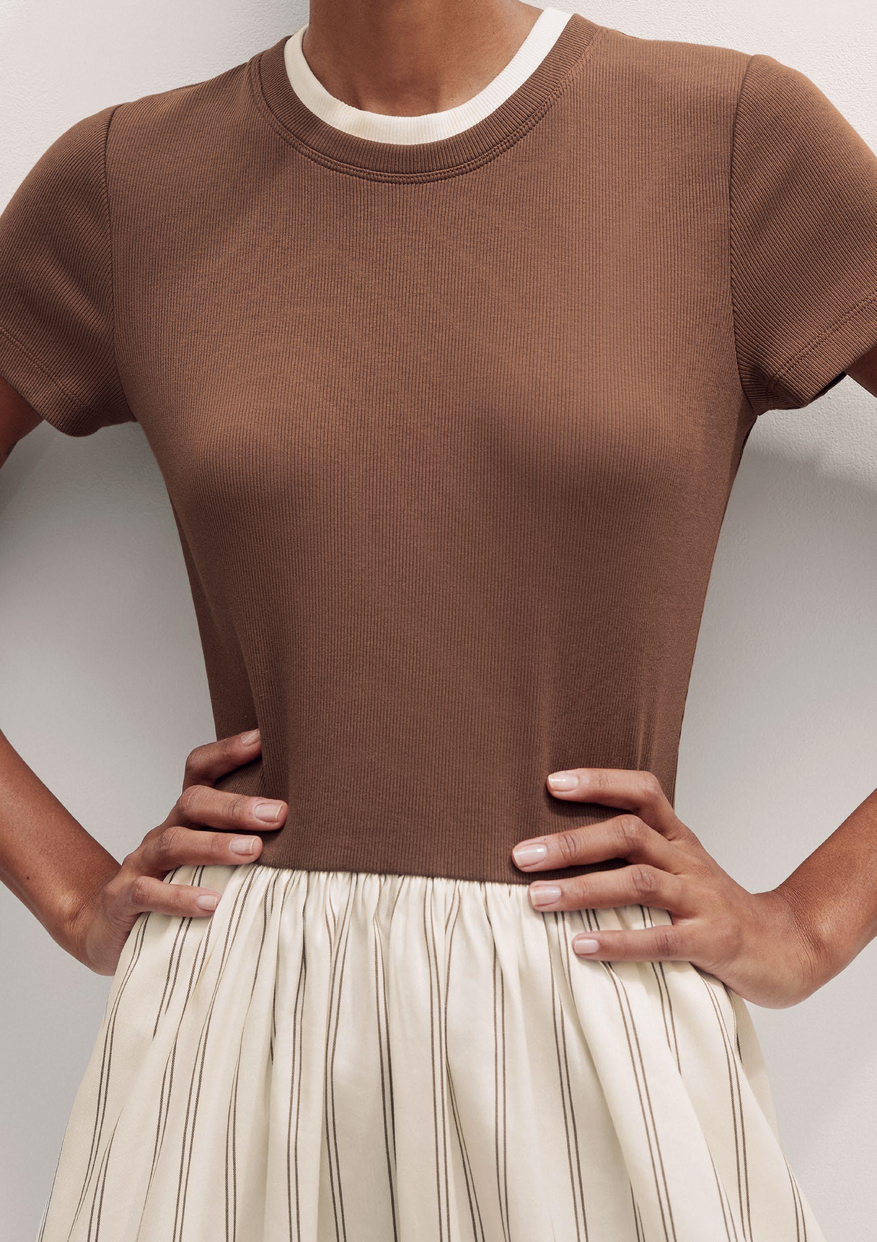 Crop Raglan Seam Rib Tee, £45, Rib Waist Maxi Skirt, £125, Stripe Longline Blazer, £350, Ultimate Button Down Rib Vest, £55, Caged Flat Sandal, £225, Reversible Tote, £250, Asymmetric Toe Loop Sandal in Tan, other colours available, £295