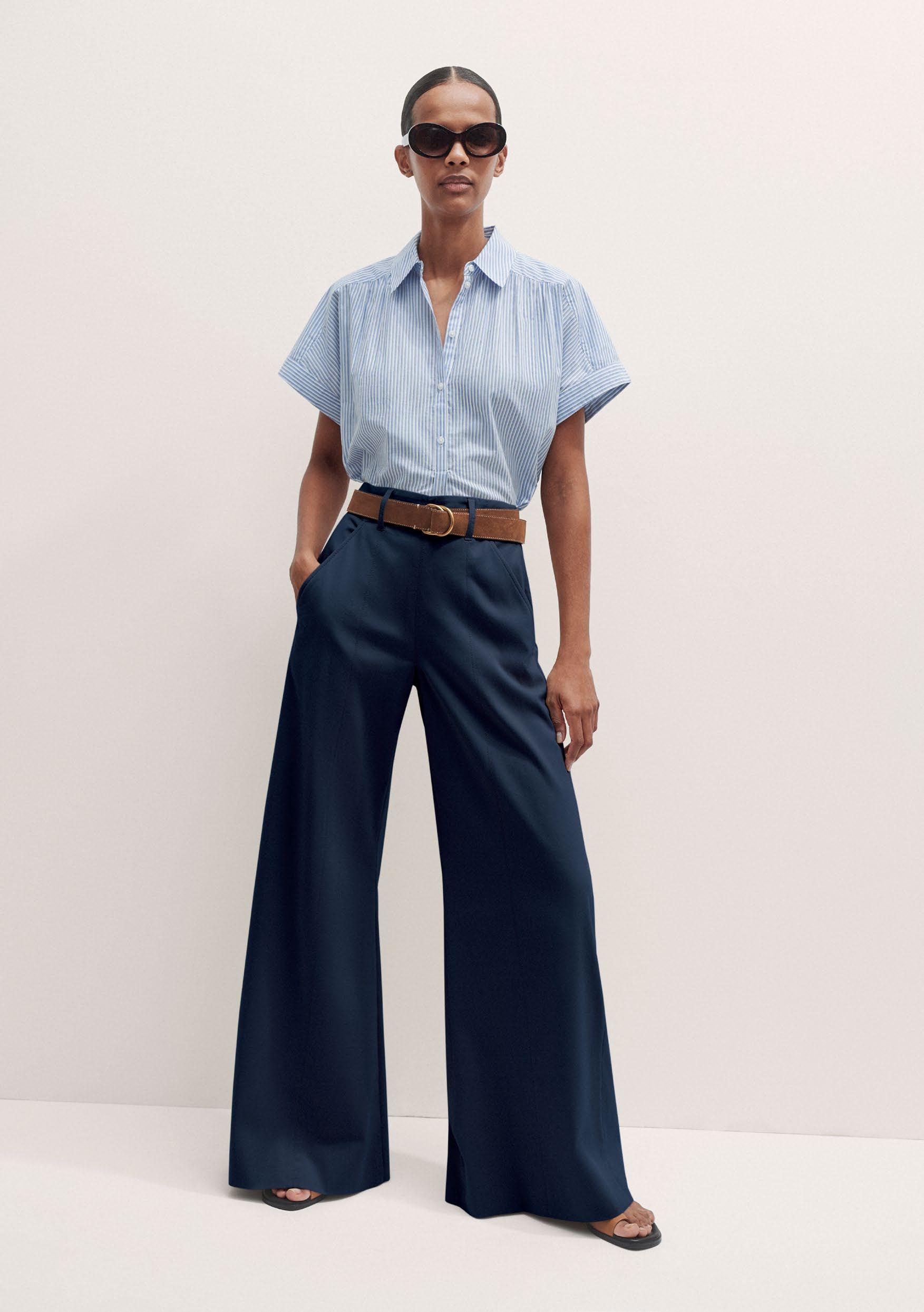 Stripe Boxy Blouse, £125, High Waist WideLeg Trouser in Navy, other colours available, £225, Double D-Ring Belt in Tobacco, other colours available, £95, Oval Frame Sunglasses in Black, other colours available, £195, Mixed Media Embroidered Sleeve Swing Top, £95, Raffia Hobo Bag, £395