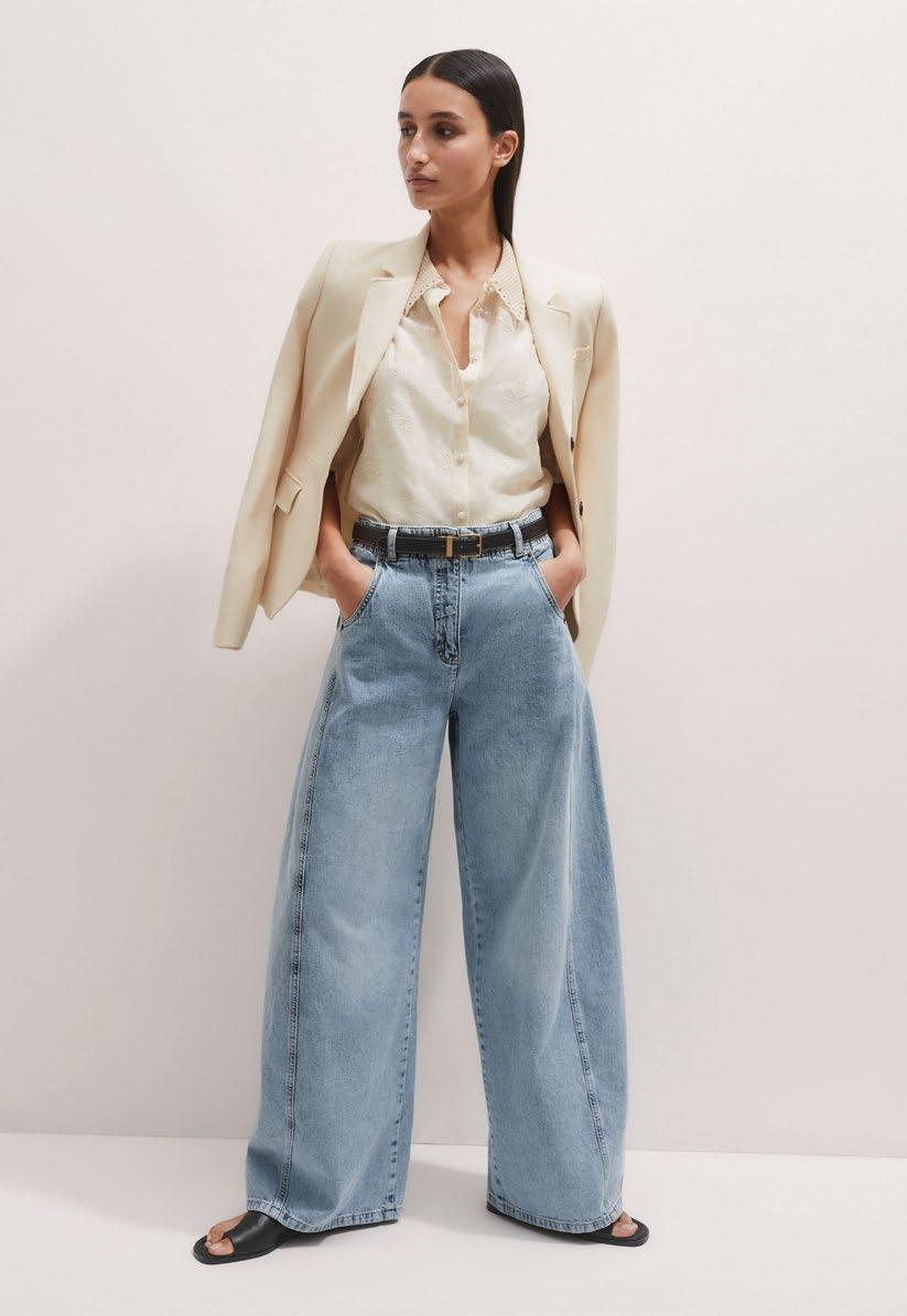 Contour Seamed Evening Blazer, £350, Ultimate Crew Neck Vest in Vanilla, other colours available, £45, Relaxed Engineered-Leg Jean, £185, Round Buckle Reversible Belt, £95, Summer Flare Trouser, £225, Slouchy V-Neck Cardigan, £175, Asymmetric Toe Loop Sandal in Black, other colours available, £295