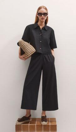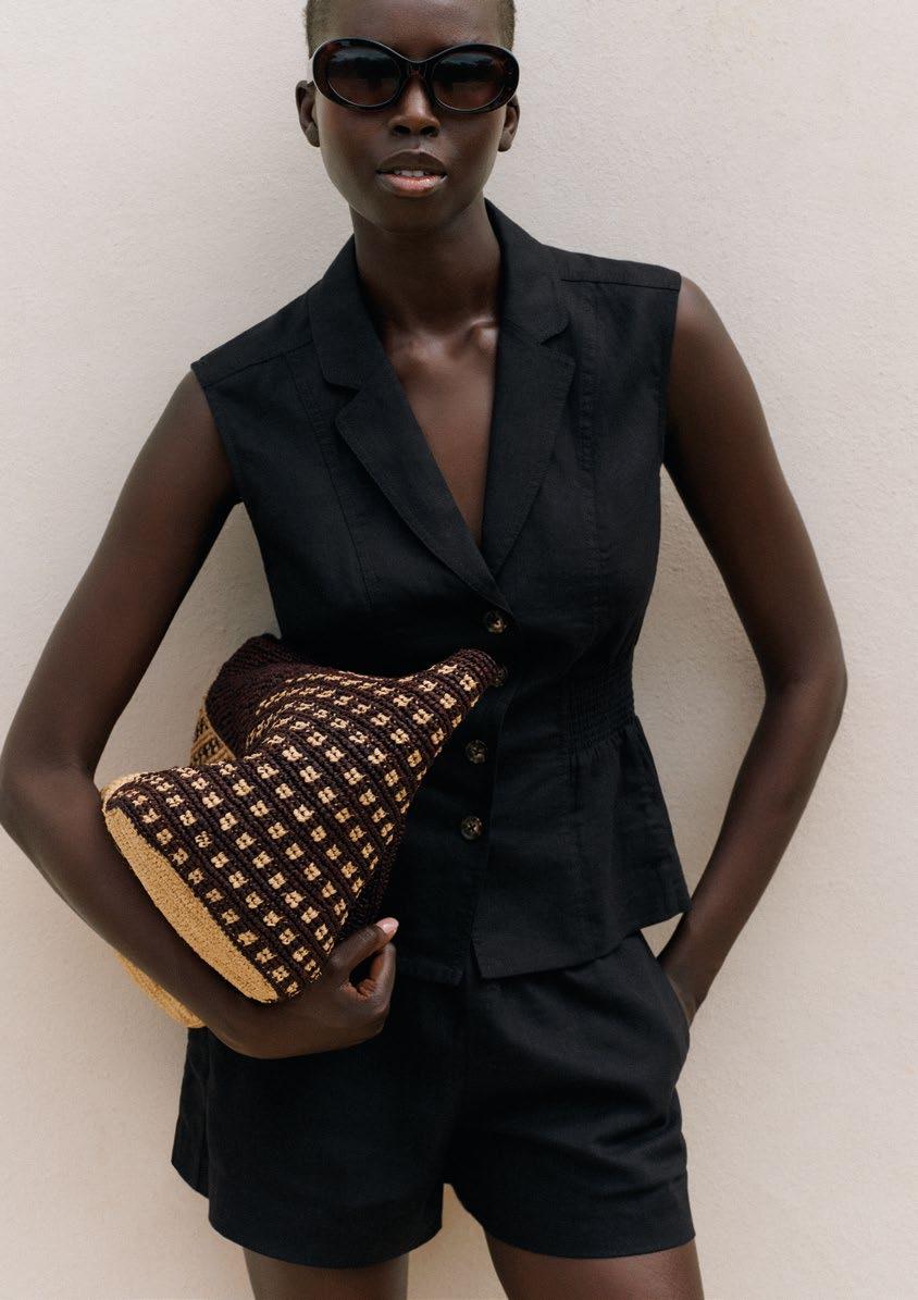 Bouclé Buttoned Vest, £95, Multi Stripe Short, £165, Fisherman Footbed Sandal in Summer Tan, other colours available, £250, Fluid Maxi Shirt Dress, £250, Fluid Crop Overshirt, £150, Relaxed WideLeg Track Pant, £225, Heptagonal Sunglasses in Nude, other colours available, £195, Asymmetric Toe Loop Sandal in Tan, other colours available, £295, Raffia Hobo Bag, £395