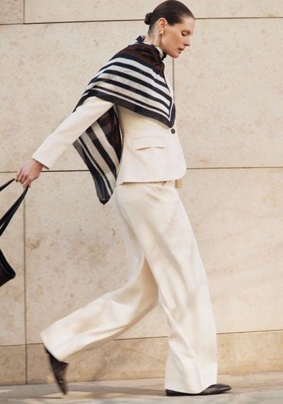 Contour Seamed Evening Blazer, £350, Summer Flare Trouser, £225, Ultimate Crew Neck Vest in Vanilla, other colours available, £45, Stripe Scarf in Black/ Chocolate/Cream, other colours available, £75