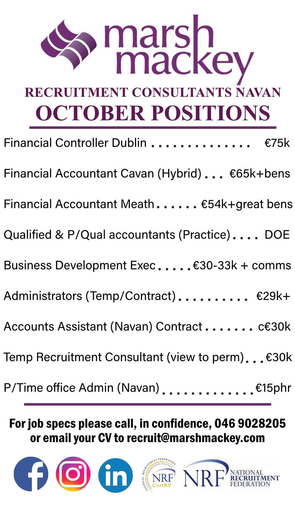 You can also check out our current jobs listing now by logging on to our website on www.marshmackey.com and also County Meath Chamber Jobs board on https:// countymeathchamber.ie/ jobscareers/meath-jobs