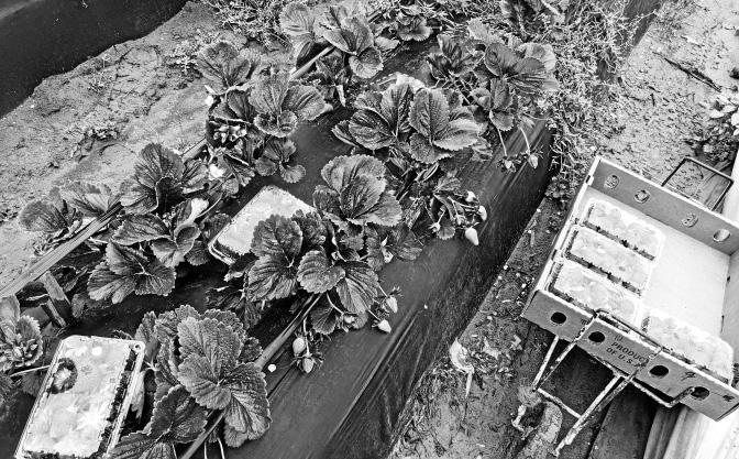 carefully fumigated inside plastic row covers to sanitize the soil – a delicate process Geyer notes that’s done with expert care. By late October, the Agriberry team starts planting strawberry crops and adjusting frost and weed row covers over them to shield them from winter weather. “