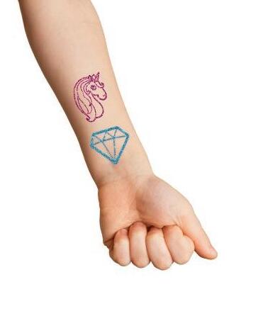 Skapa glittertatueringar. Med över 25 tatueringar och 4 glitterfärger. Från 8