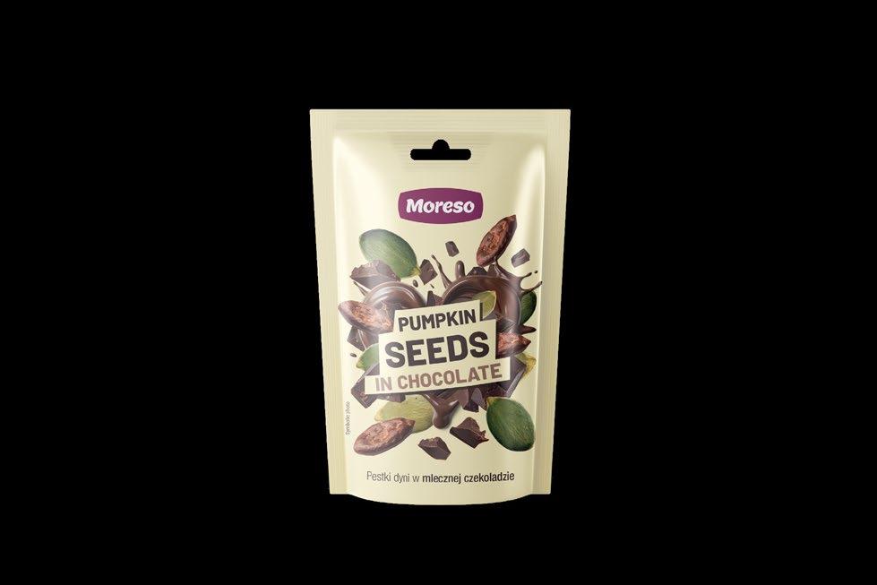 Polish pumpkin seeds by Moreso, coated in milk and dark chocolate with a hint of salt. A flavourful snack in a convenient doypack pouch with a resealable zipper. Perfectly aligned with current food trends. Available in 70 g packs under the Moreso brand or for private label projects.