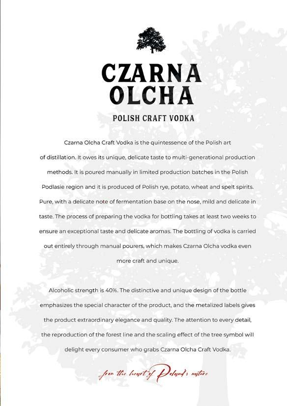Craft Vodka Czarna Olcha Rye is the quintessence of Polish distilling art. Its unique, delicate flavor stems from generations of production methods. Hand-bottled in limited batches in the Podlasie region of Poland using Polish rye spirit. It’s pure, with a subtle hint of fermentation base perceptible on the nose, and the taste is mild and delicate. The alcohol content is 40%. The distinctive and unique bottle design highlights the product’s distinctive character, while the gold label evokes the color of the grain and lends it exceptional elegance and quality. Attention to every detail, the rendering of the forest line, and the scaling effect of the tree symbol will delight every consumer who holds Czarna Olcha Rye Craft Vodka in their hands.
