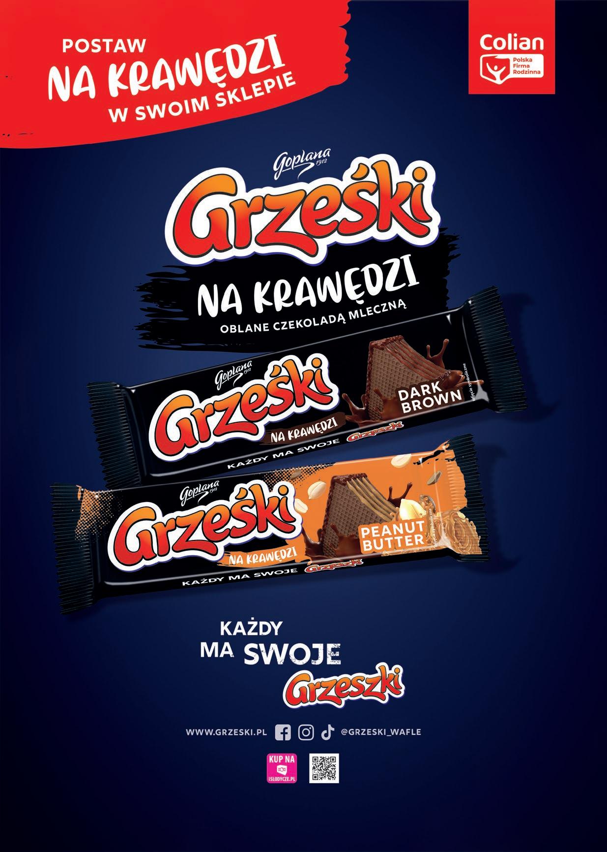 Grześki na krawędzi to nowa odsłona kultowych słodyczy, która zachwyca nie tylko swoim wspaniałym smakiem, lecz także nieoczywistą formą podania. Wafle zostały oblane po bokach wysokiej jakości czekoladą Goplana. Dostępne są w dwóch pysznych odsłonach. Grześki na krawędzi DARK BROWN to wersja o intensywnym kakaowym smaku. Druga propozycja to Grześki na krawędzi PEANUT BUTTER. Ten wyjątkowy chrupiący wafel skrywa w sobie krem o smaku masła orzechowego. www.GRZESKI.pl