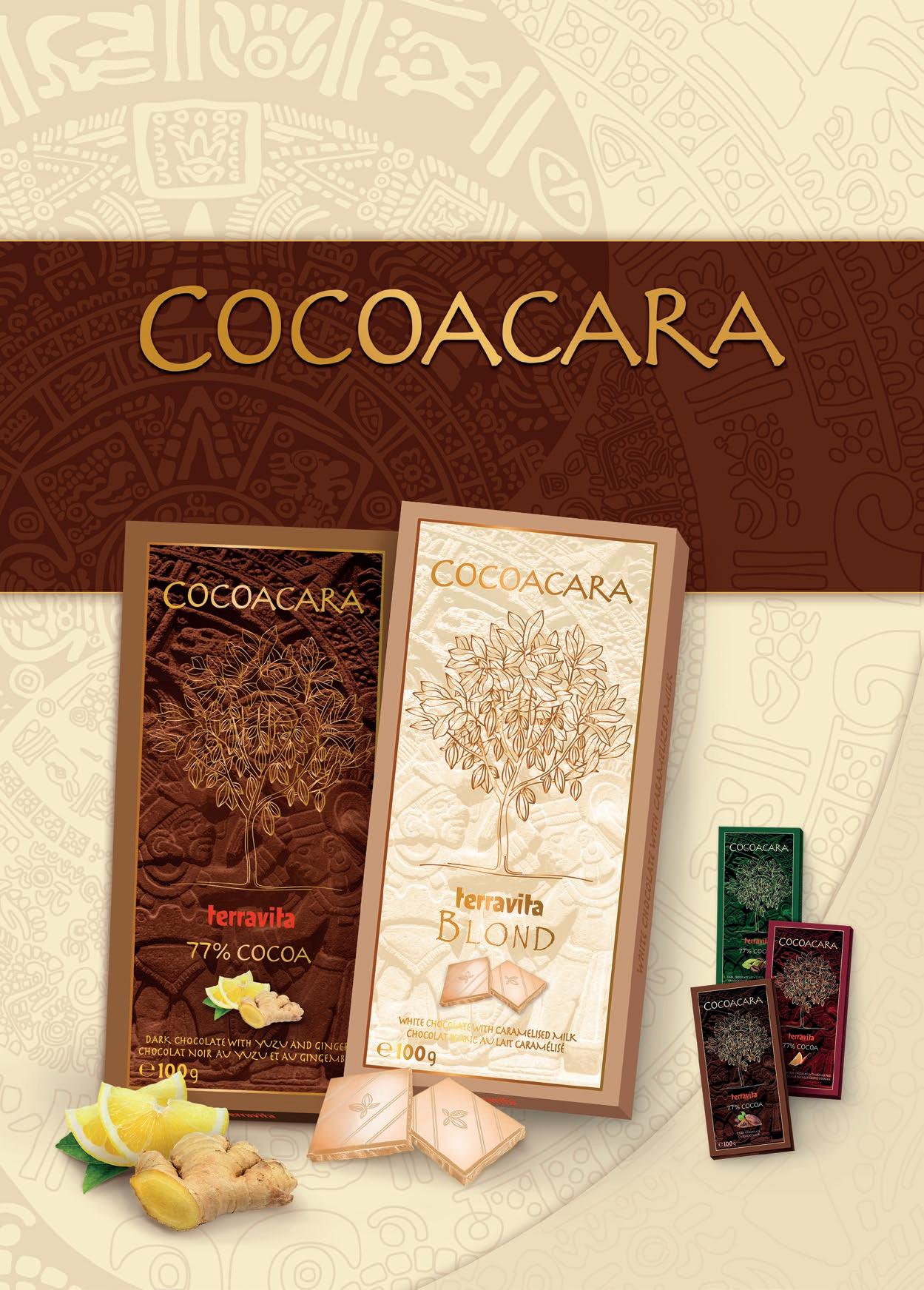 Cocoacara to linia czekolad premium o wysokiej zawartości kakao (77%) w eleganckich kartonikach, doskonale nadających się na drobny upominek. Kolekcja czekolad gorzkich powiększyła się o dwa nowe smaki, w tym jeden nietypowy dla tej linii – czekoladę białą. Cocoacara yuzu & imbir to połączenie wytrawnej, gorzkiej czekolady ze świeżymi i kwiatowymi nutami owocu yuzu i rozgrzewającym, lekko pikantnym smakiem imbiru. Cocoacara Blond to biała czekolada na bazie karmelizowanego mleka, czego efektem jest piękny złoty kolor i charakterystyczny smak aromatycznego karmelu. www.TERRAVITA.pl