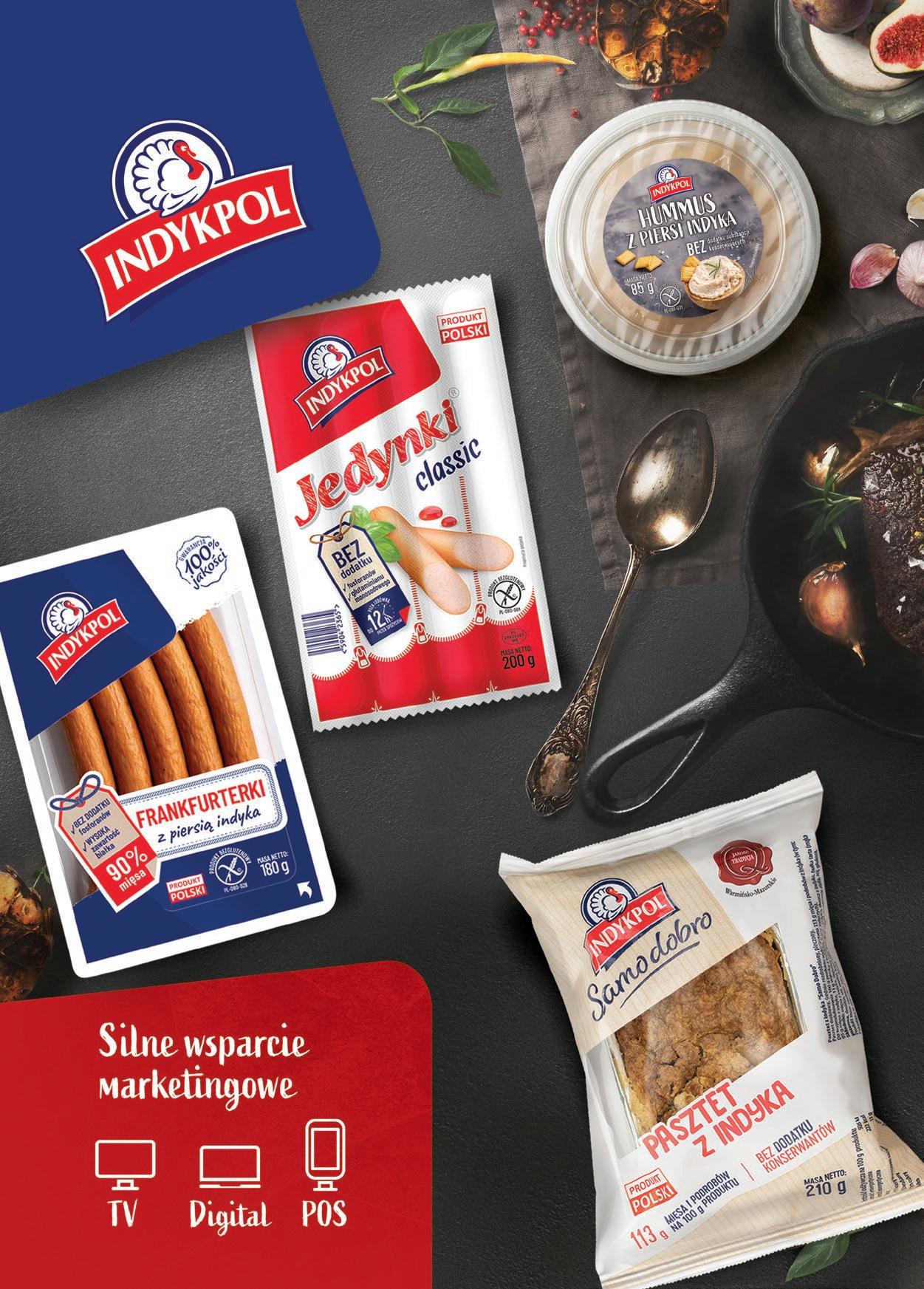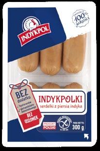 Indykpol poszerza ofertę parówek o serdelki pod marką INDYKPOLKI. Wyróżnia je wysoka zawartość białka, brak dodatku fosforanów i glutaminianu monosodowego. Nowy produkt powstał z mięsa indyka, a dostępny jest w wariancie stałowagowym, w gramaturze 300 g, oraz w wersji przeznaczonej do lady tradycyjnej, w opakowaniu 700 g. www.INDYKPOL.pl