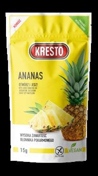 Naturalnie słodki smak ananasa sprawia, że owoc ten jest cenionym składnikiem deserów, wypieków i napojów. Bardzo dobrze komponuje się także z jogurtem, stanowiąc bazę pysznej przekąski lub pożywnego śniadania. Liofilizacja to proces polegający na usunięciu wody z zamrożonych wcześniej produktów – dzięki temu owoce są chrupkie oraz mają intensywny smak i naturalny aromat. Zachowują też więcej cennych wartości odżywczych niż w procesie tradycyjnego suszenia. Do wyprodukowania 100 g ananasa liofilizowanego zużyto 0,7 kg ananasa świeżego. Opakowanie o gramaturze 15 g. www.VOG.pl