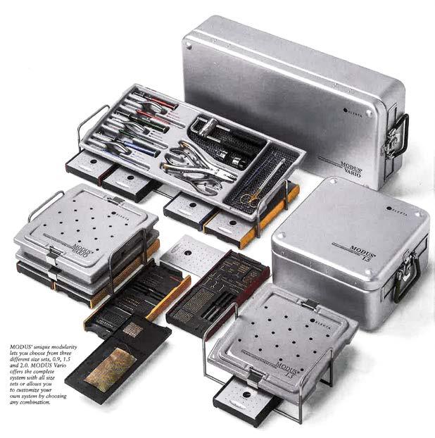 MODUS, a modular, colour-coded complete system for implants in the CMF industry, was available at this time in four versions: red sets (screw diameter 0.9mm-1.2mm) with the world’s smallest titanium screw for the skull and face, green sets (1.5mm1.8mm) for the midface, blue sets (2.0mm-2.3mm)