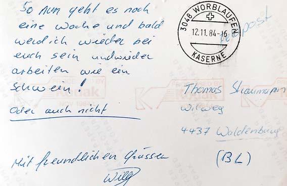 Thomas Straumann and Willi Miesch met as apprentices at the Straumann Institute and quickly became close friends. Willi Miesch sent his friend a photo postcard by post from his time as a recruit in 1984: “So now it’s one more week and soon I’ll be back with you and working like a dog again! Or not! Kind regards, Willy”