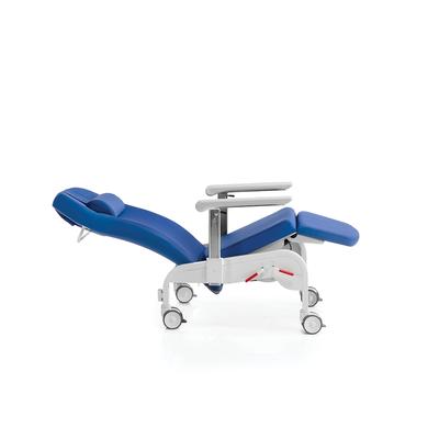 Constructed on an epoxy-coated steel frame, it includes essentials like IV po e sockets and under-seat footrests, and features gas strut control for independent adjustment of the backrest and leg rest. The chair is upholstered in antibacterial vinyl and mounted on two braked Ø50 mm castors
