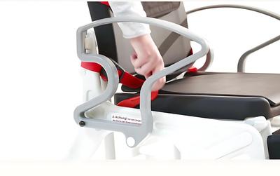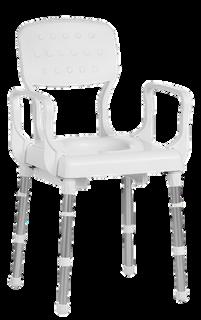 It features swing-open armrests to facilitate safe and seamless side transfers, a removable pail on smooth rails, and a cushioned seat for patient comfort