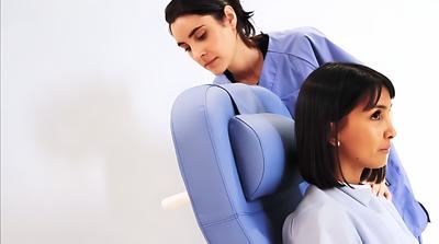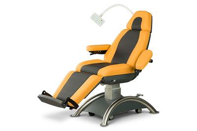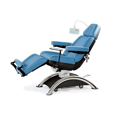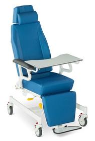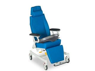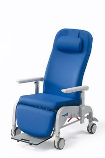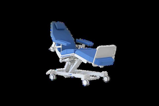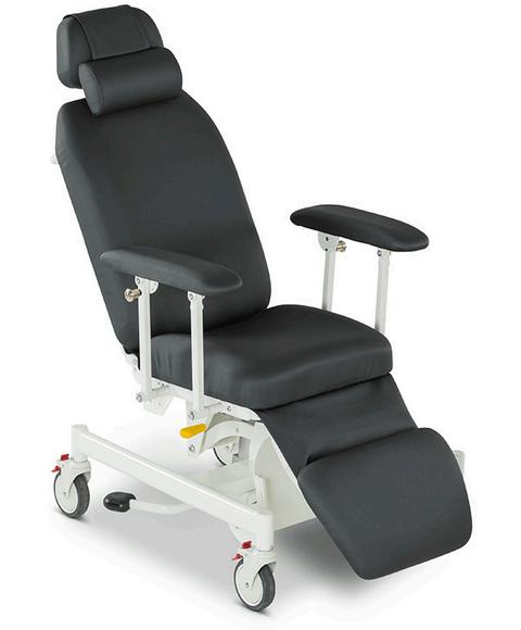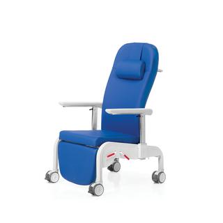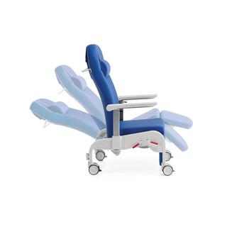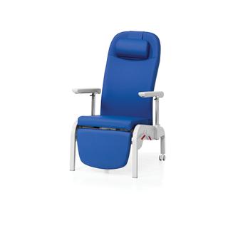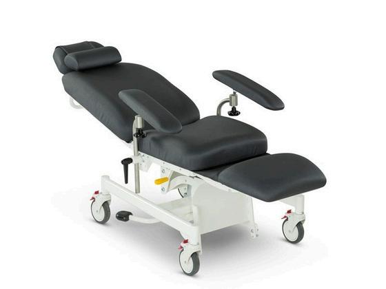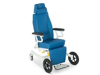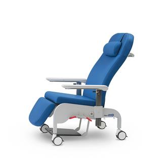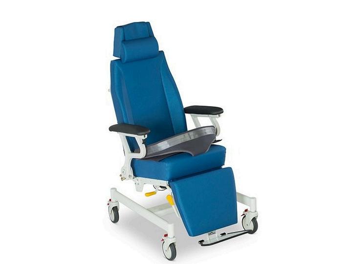 Its robust epoxy-coated steel frame and seamless hygienic upholstery meet stringent infection-control requirements, and the chair includes features like locking 125 mm castors with directional control five-position folding armrests with quicklock means, an ergonomically shaped seat, and a neck cushion with hygiene-oriented handles and knobs.